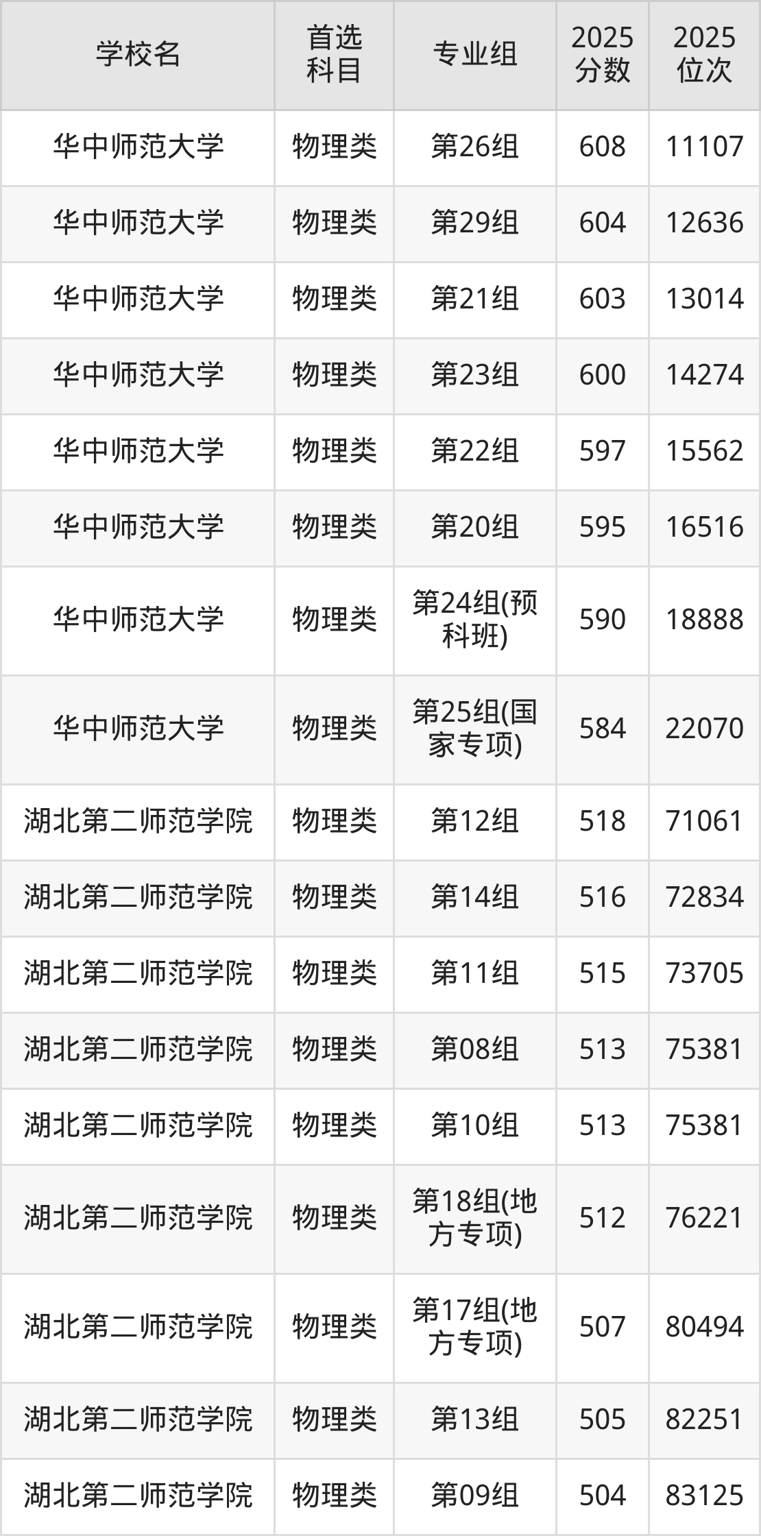 (2)湖北第二师范学院第13组:505分、82251名;