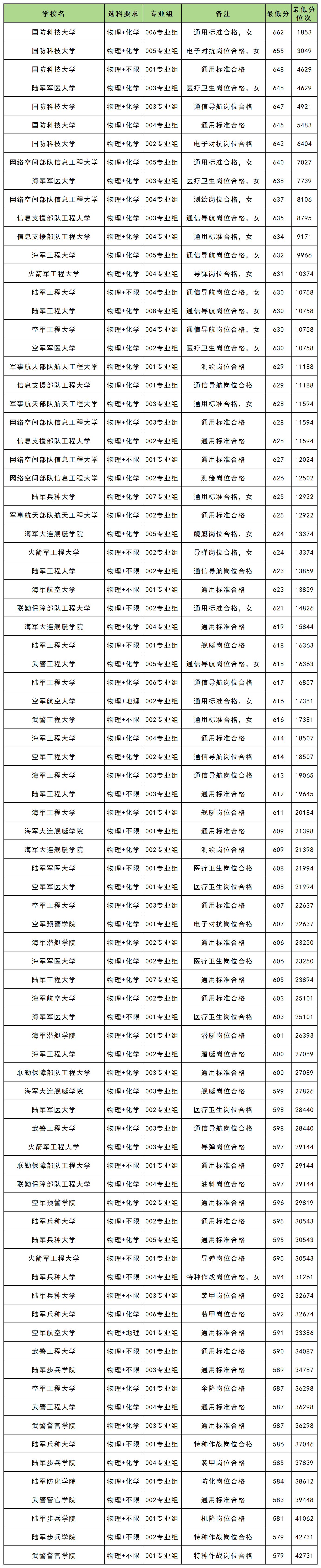 2025年安徽军校物理类录取分数线在579分-662分之间,分数最高的是国防科技大学006专业组(女生)(通信导航岗位合格),2025年最低投档线662分;分数线最低的是武警警官学院001专业组(特种作战岗位合格)和陆军步兵学院002专业组(特种作战岗位合格),2025年投档最低分为579分。