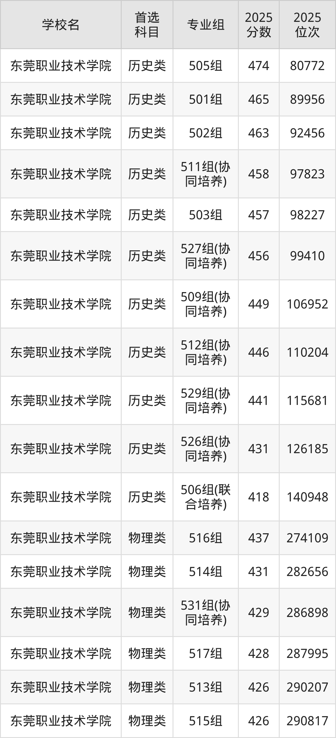 (3)东莞职业技术学院529组(协同培养):441分、115681名;
