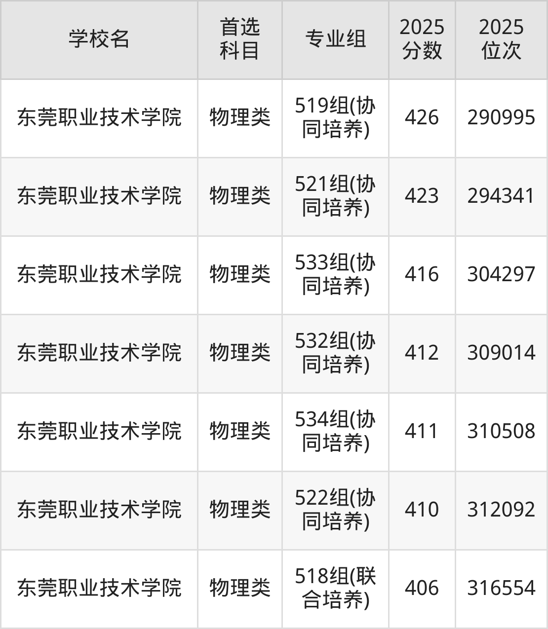(2)东莞职业技术学院532组(协同培养):412分、309014名;