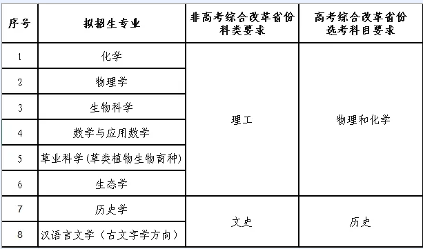 2024年兰州大学招生专业:化学、物理学、生物科学、数学与应用数学、草业科学(草类植物生物育种)、生态学、历史学、汉语言文学(古文字学方向)。