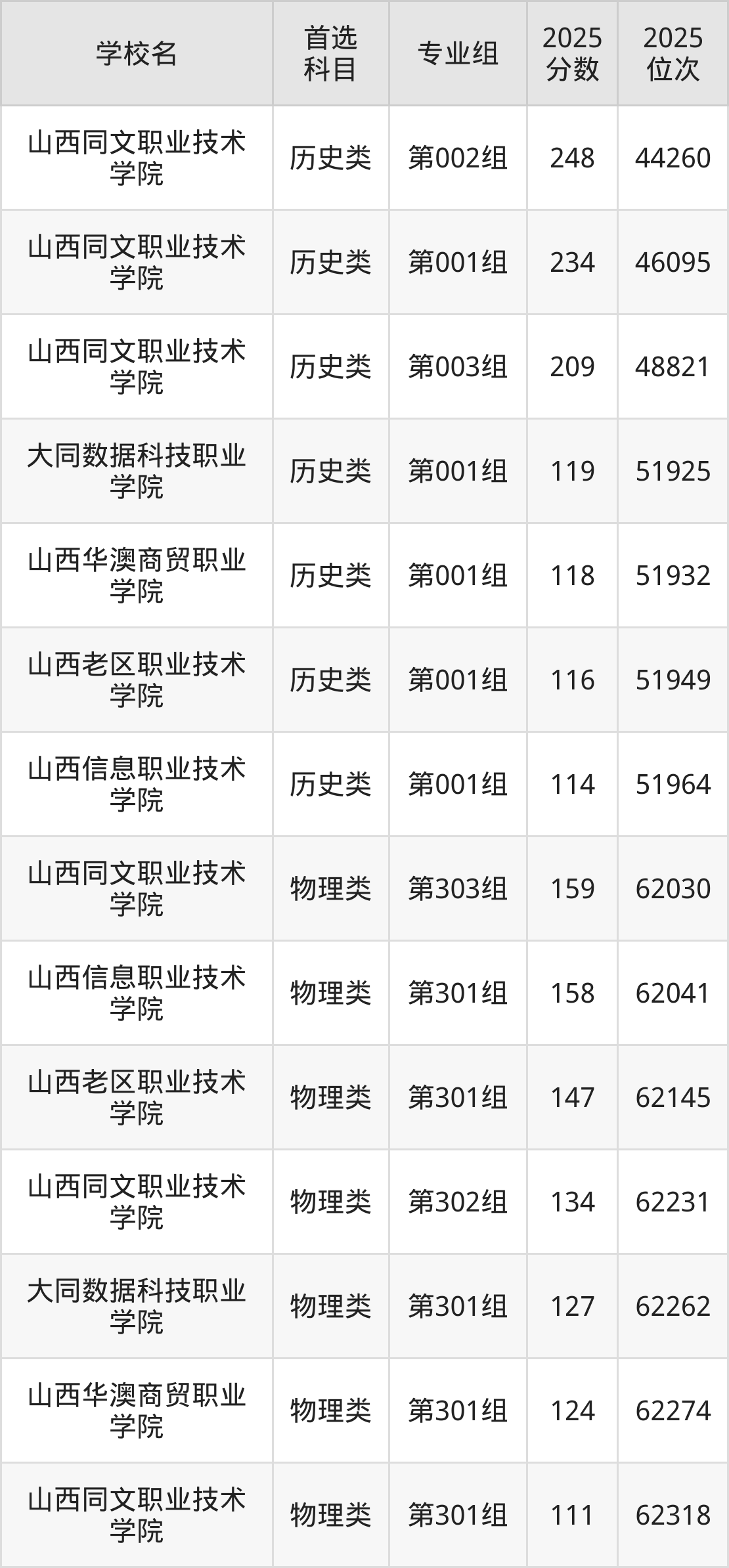 2025年一共有5所民办专科在山西物理类招生,包含了7个专业组,录取分数线从111分到159分不等,对应最低位次从62318名到62030名。下面分别展示山西省分数线最低的五个院校专业组。