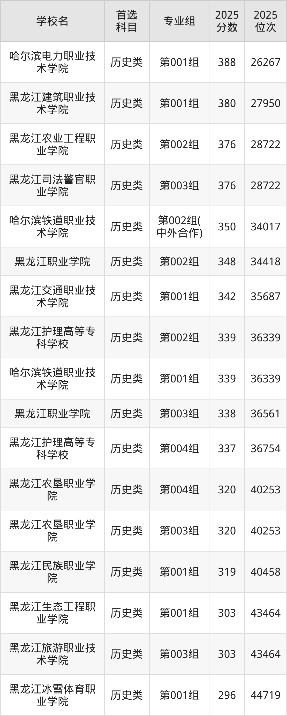 2025年一共有16所公办大专在哈尔滨历史类招生,包含了22个专业组,录取分数线从236分到388分不等,对应最低位次从52159名到26267名。下面分别展示哈尔滨市分数线最高、最低的五个院校专业组。