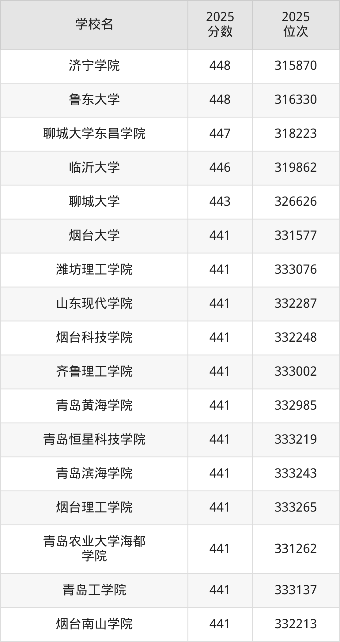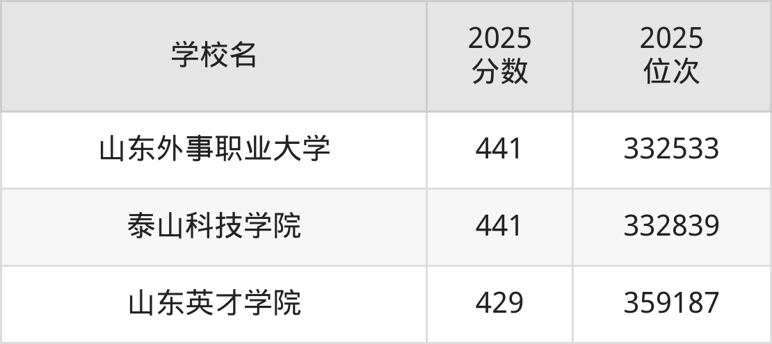(3)山东外事职业大学:441分、332533名;