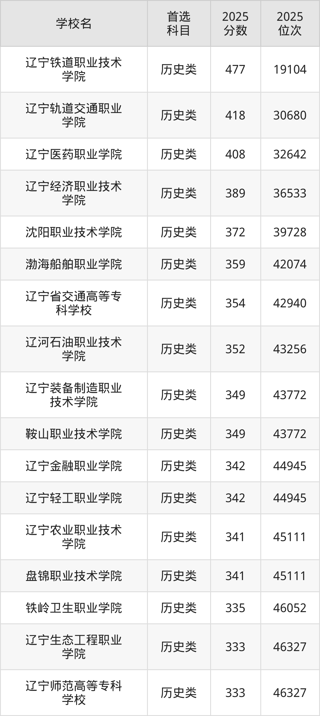 (1)辽宁铁道职业技术学院:477分、19104名;