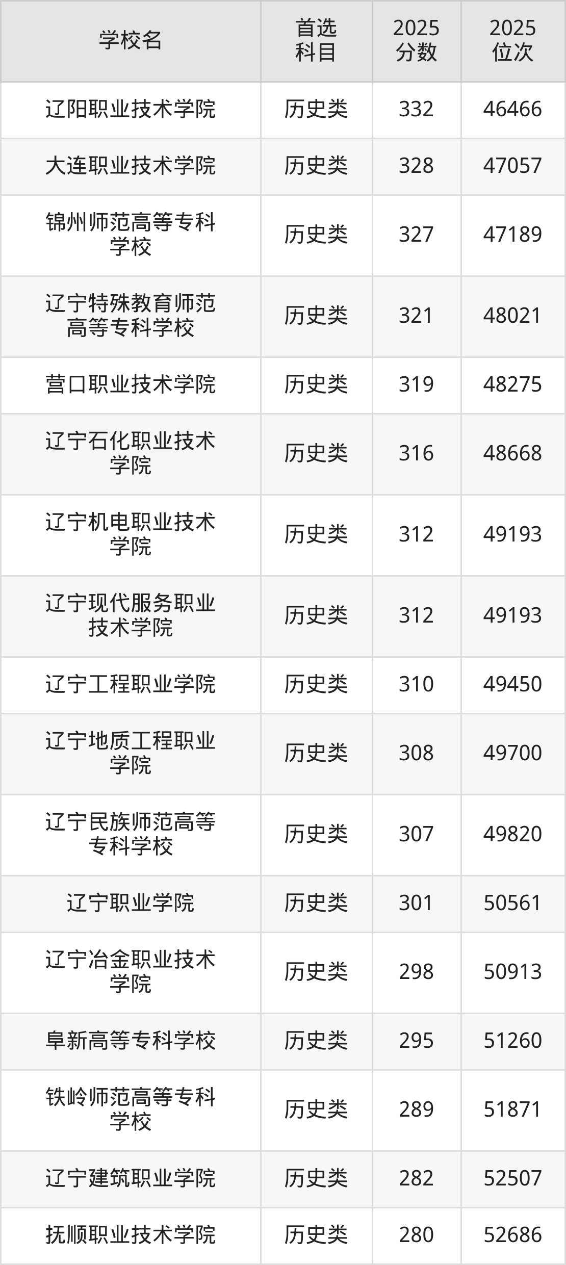 (4)抚顺职业技术学院:280分、52686名;