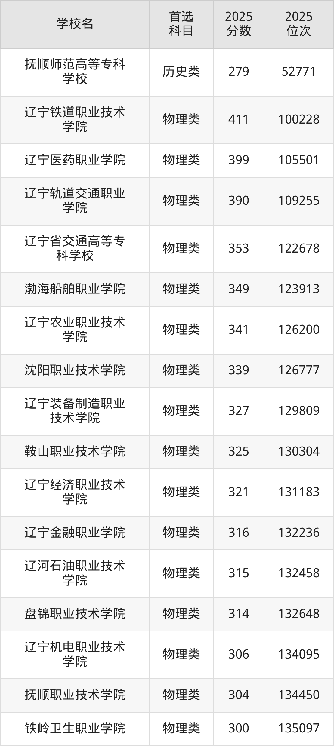 (3)辽宁轨道交通职业学院:390分、109255名;