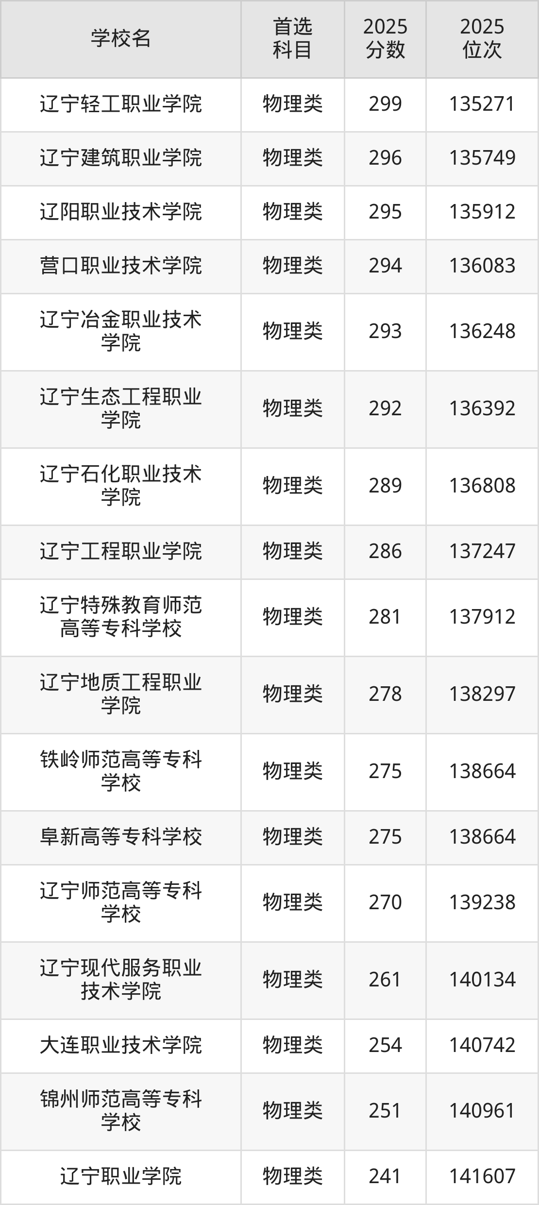 (3)辽宁职业学院:241分、141607名;