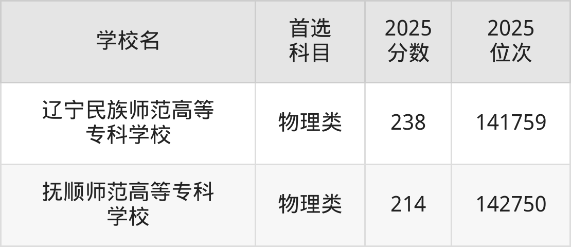 (5)抚顺师范高等专科学校:214分、142750名;