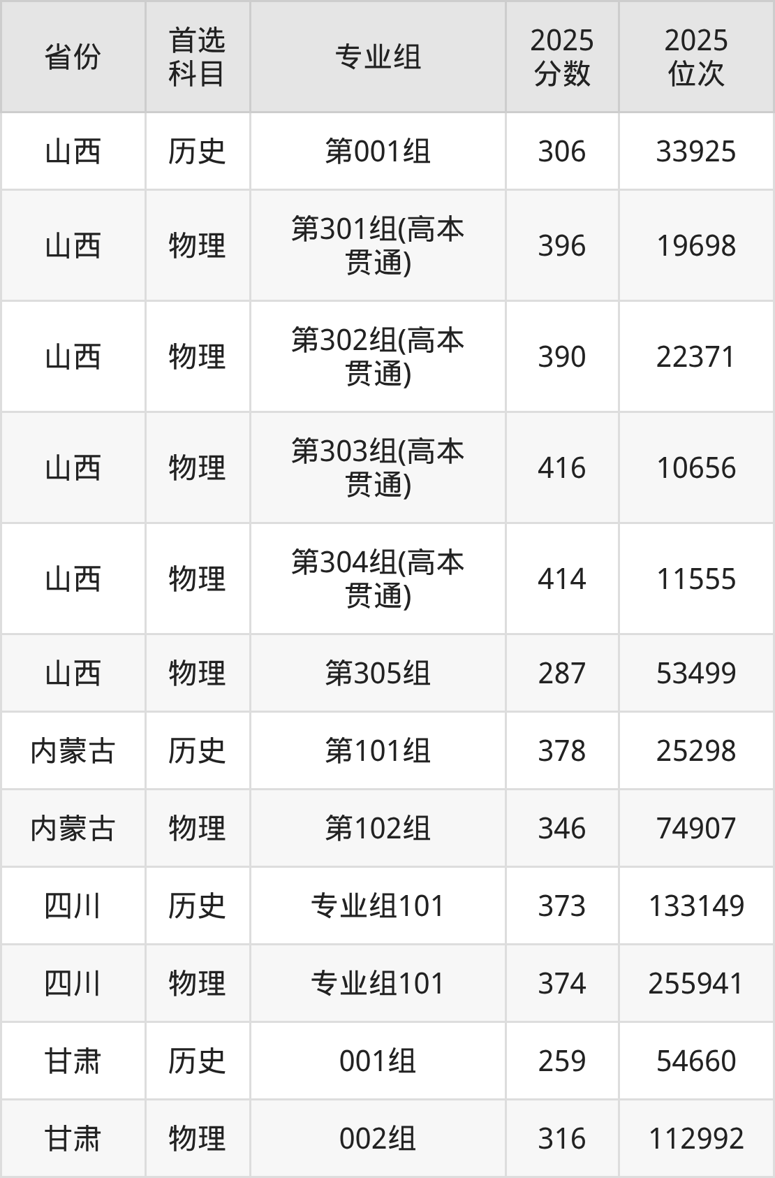 因为大部分地区目前只公布了院校(专业组)分数线,为了方便2026年考生参考,本文就整理出太原城市职业技术学院在全国各省不同科类的最低分: