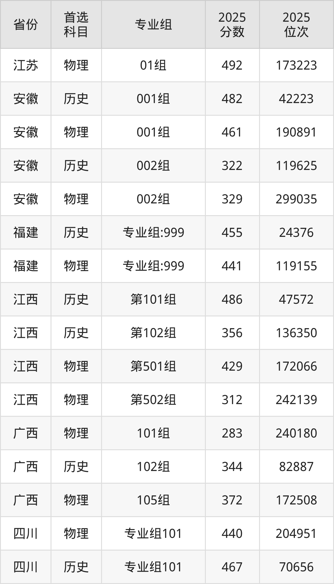 因为大部分地区目前只公布了院校(专业组)分数线,为了方便2026年考生参考,本文就整理出浙江广厦建设职业技术大学在全国各省不同科类的最低分: