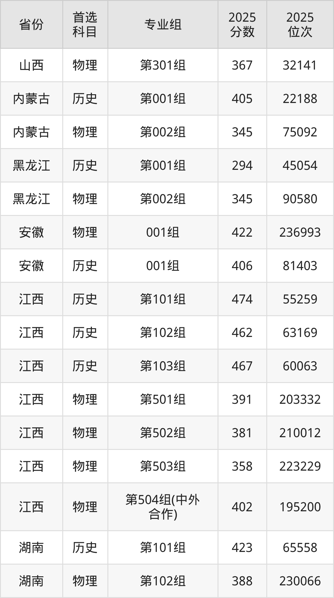 因为大部分地区目前只公布了院校(专业组)分数线,为了方便2026年考生参考,本文就整理出宜春职业技术学院在全国各省不同科类的最低分: