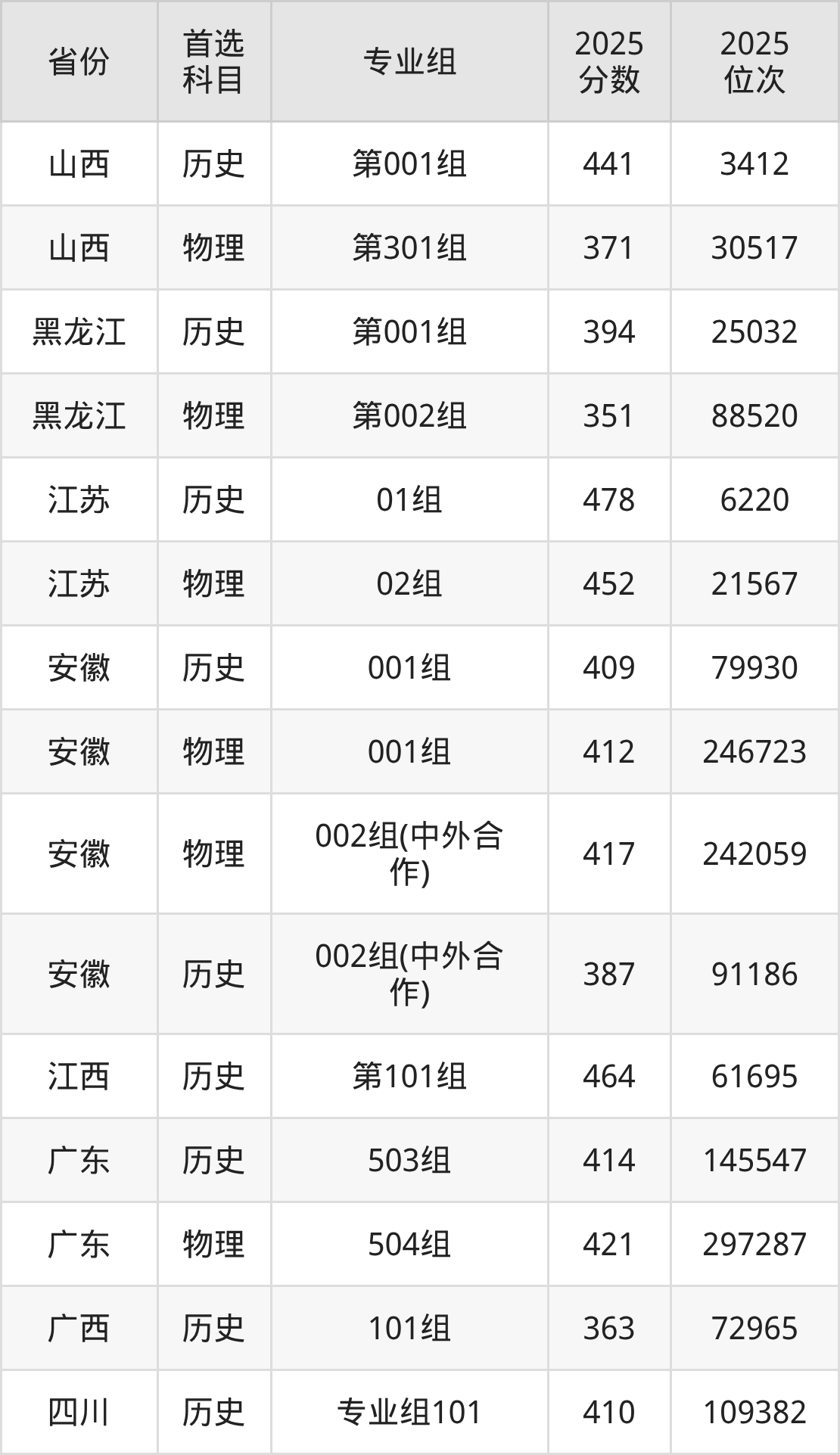 因为大部分地区目前只公布了院校(专业组)分数线,为了方便2026年考生参考,本文就整理出安徽审计职业学院在全国各省不同科类的最低分: