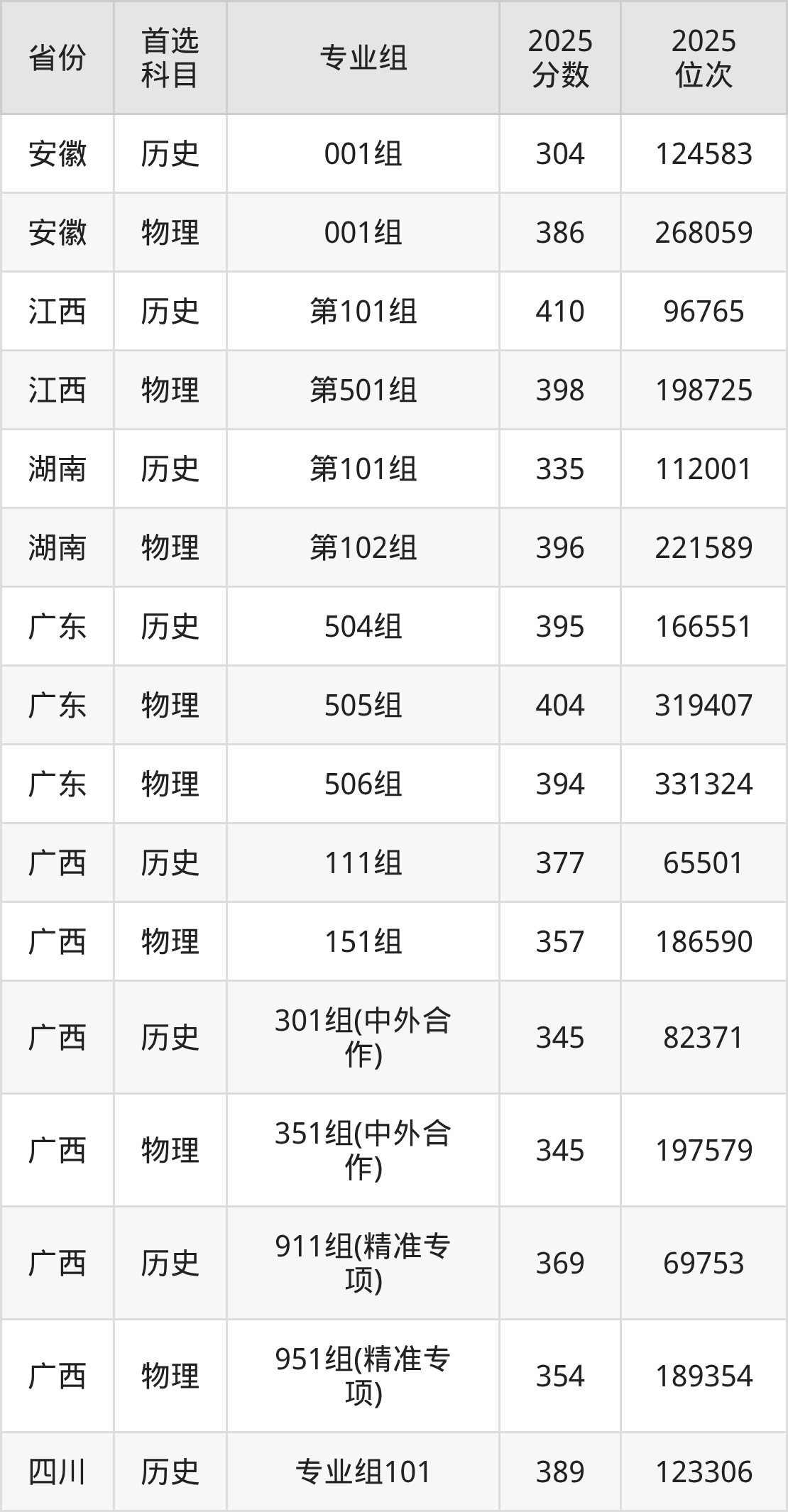 因为大部分地区目前只公布了院校(专业组)分数线,为了方便2026年考生参考,本文就整理出广西水利电力职业技术学院在全国各省不同科类的最低分: