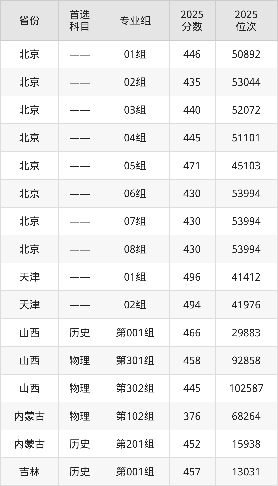 因为大部分地区目前只公布了院校(专业组)分数线,为了方便2026年考生参考,本文就整理出北京城市学院在全国各省不同科类的最低分: