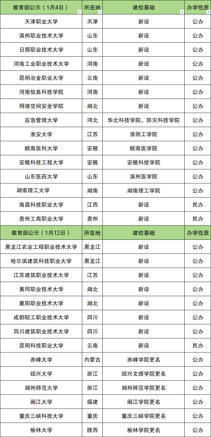 四川新增2所:成都轻工职业技术大学、四川建筑职业技术大学;