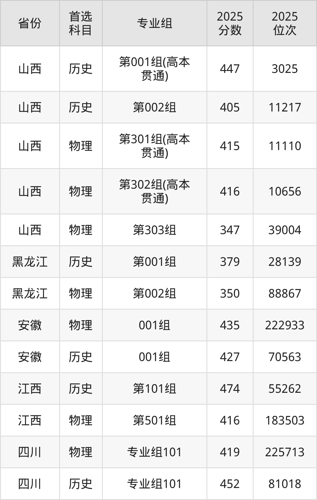 因为大部分地区目前只公布了院校(专业组)分数线,为了方便2026年考生参考,本文就整理出山西铁道职业技术学院在全国各省不同科类的最低分: