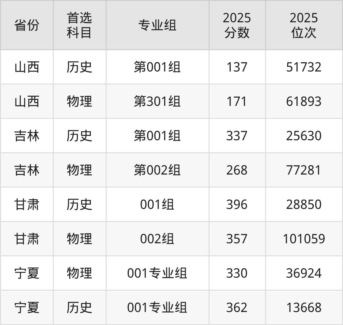 因为大部分地区目前只公布了院校(专业组)分数线,为了方便2026年考生参考,本文就整理出朔州师范高等专科学校在全国各省不同科类的最低分: