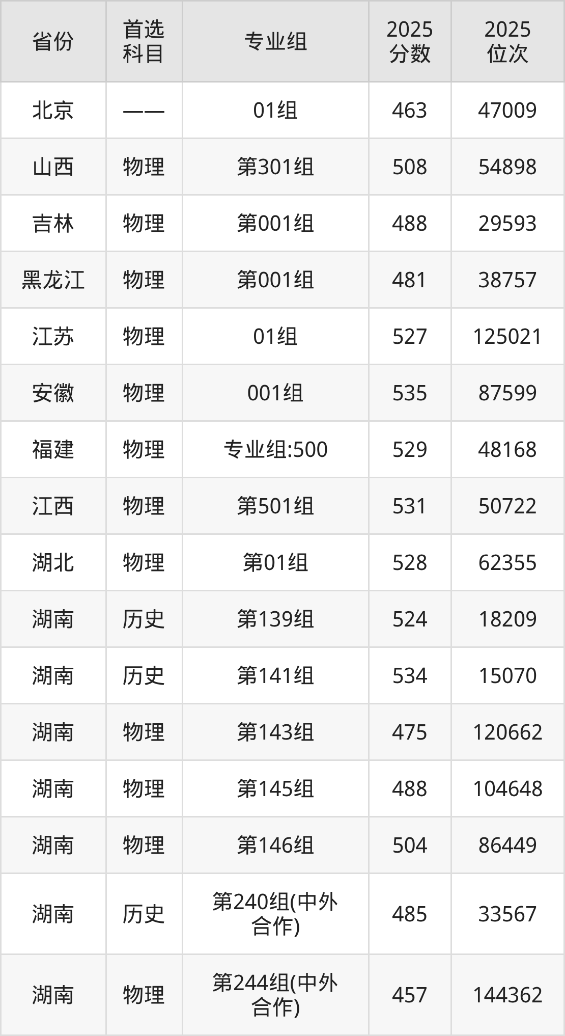 因为大部分地区目前只公布了院校(专业组)分数线,为了方便2026年考生参考,本文就整理出湖南第一师范学院在全国各省不同科类的最低分: