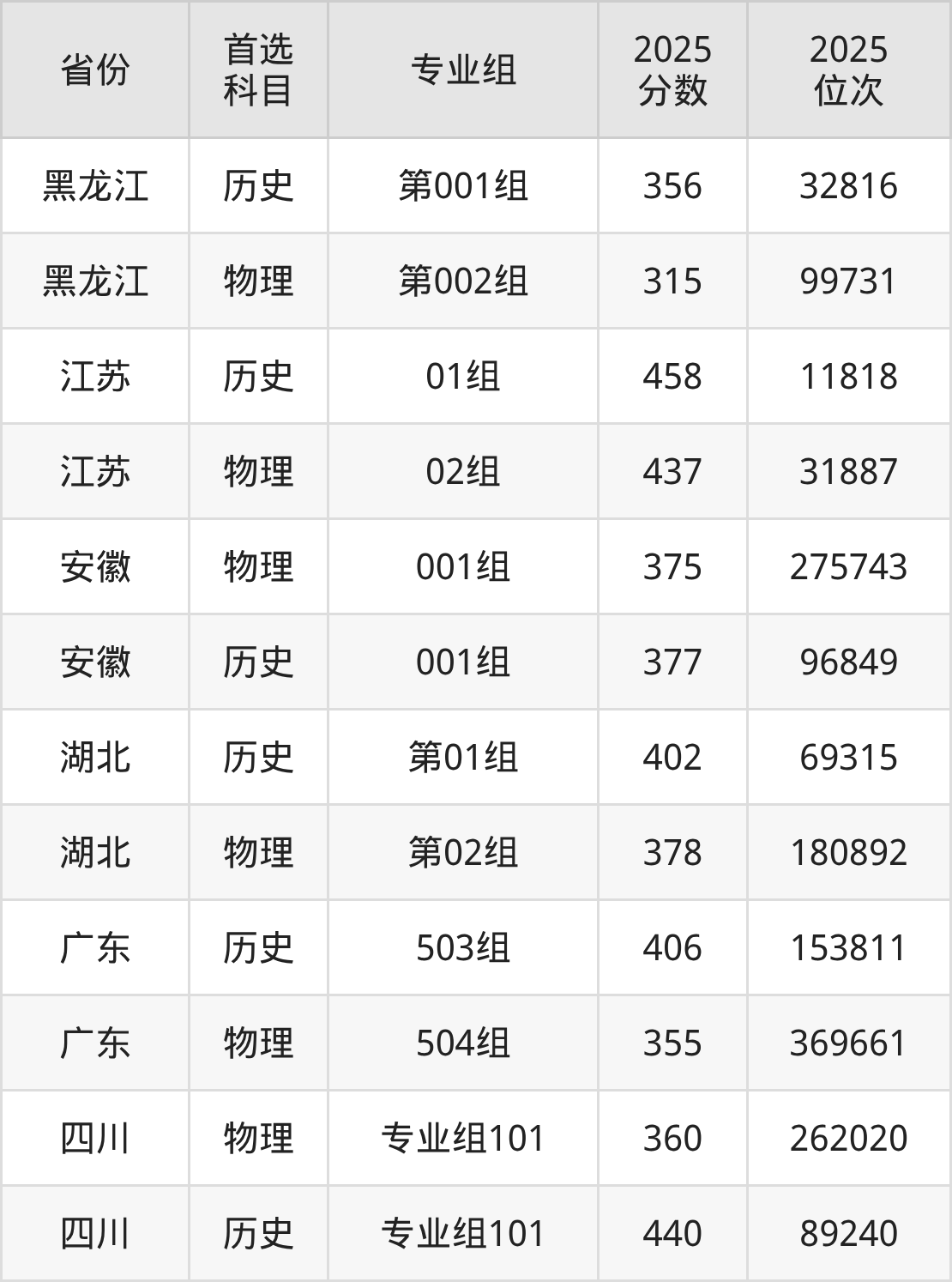 因为大部分地区目前只公布了院校(专业组)分数线,为了方便2026年考生参考,本文就整理出安徽粮食工程职业学院在全国各省不同科类的最低分: