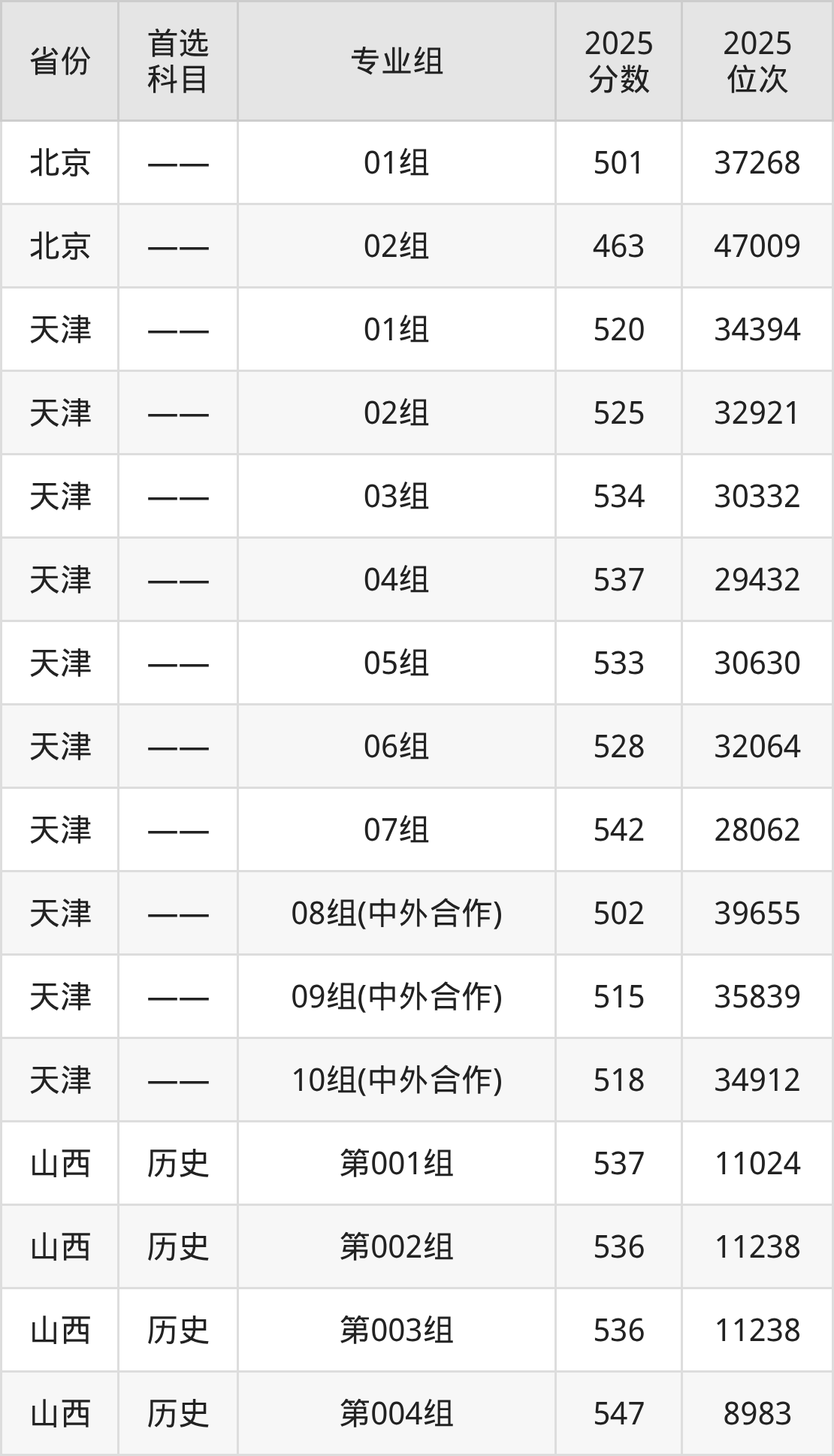 因为大部分地区目前只公布了院校(专业组)分数线,为了方便2026年考生参考,本文就整理出天津城建大学在全国各省不同科类的最低分: