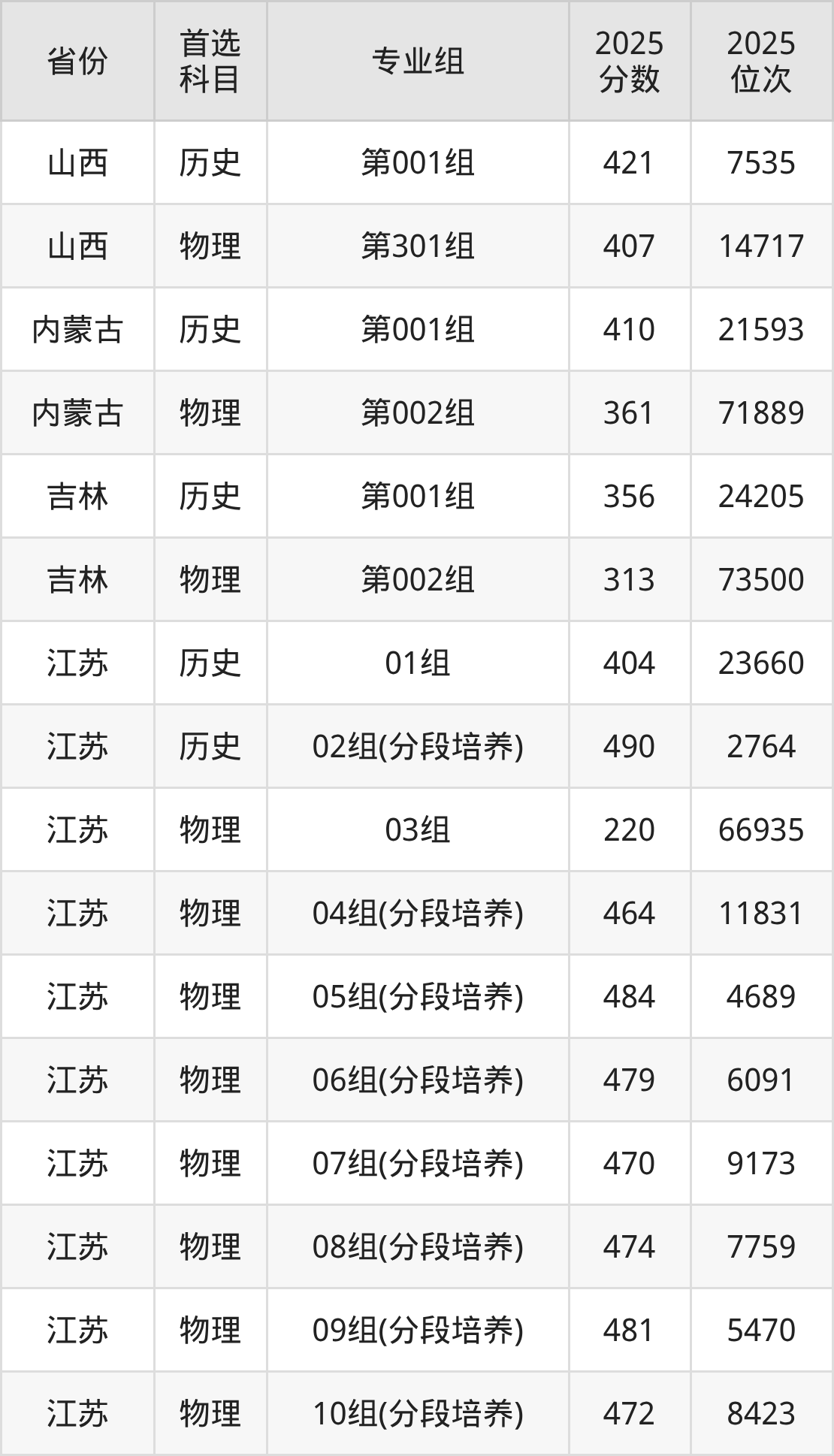 徐州工业职业技术学院各专业录取分数线为:电气自动化技术461分、无人机应用技术459分、生物制药技术451分等,以上均参考自2025年浙江的录取数据,具体各专业分数线详见下文。