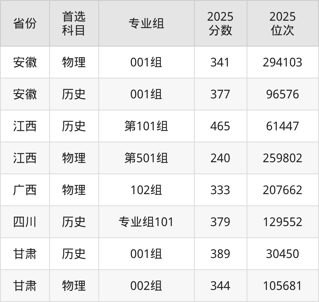 因为大部分地区目前只公布了院校(专业组)分数线,为了方便2026年考生参考,本文就整理出桐城师范高等专科学校在全国各省不同科类的最低分: