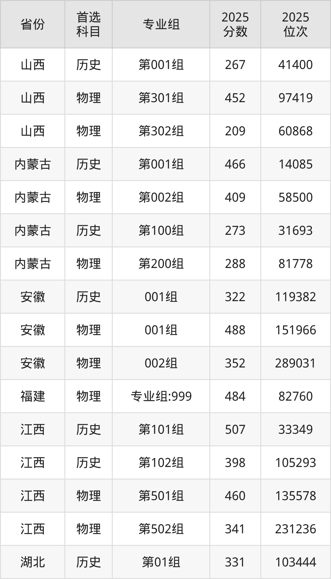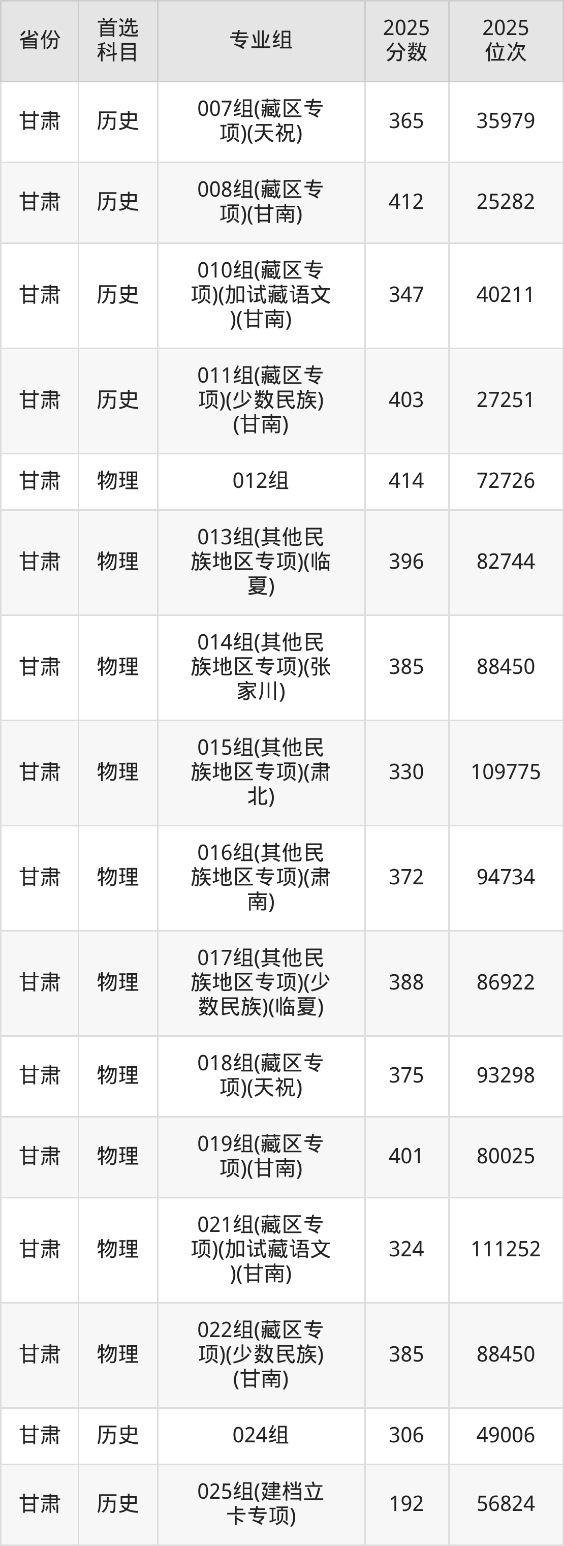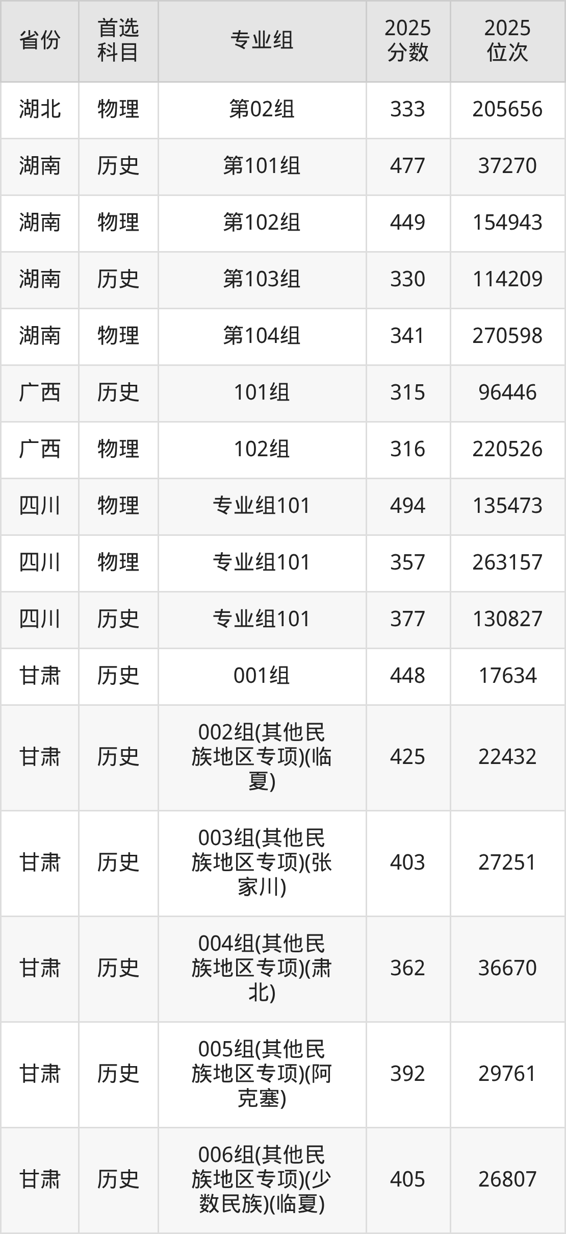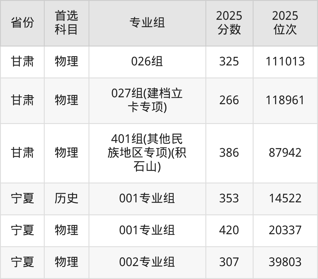 因为大部分地区目前只公布了院校(专业组)分数线,为了方便2026年考生参考,本文就整理出甘肃林业职业技术大学在全国各省不同科类的最低分: