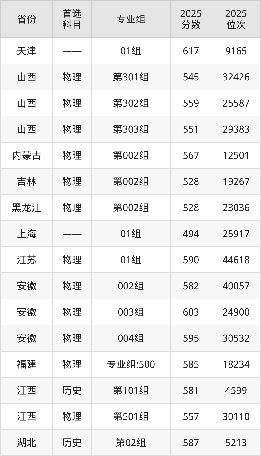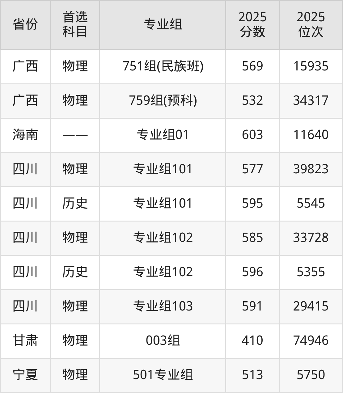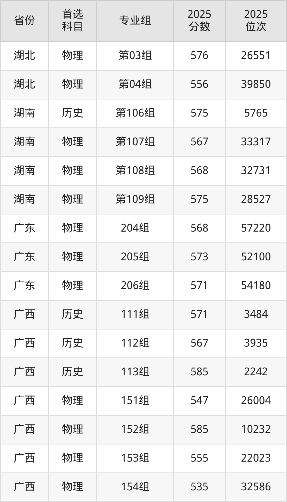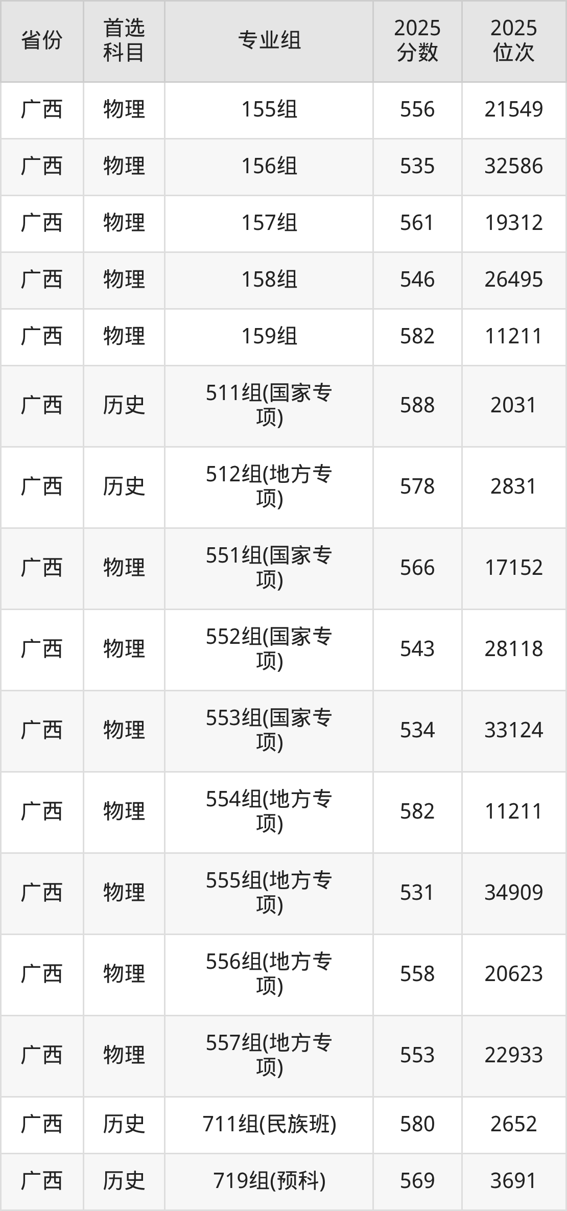 因为大部分地区目前只公布了院校(专业组)分数线,为了方便2026年考生参考,本文就整理出广西大学在全国各省不同科类的最低分: