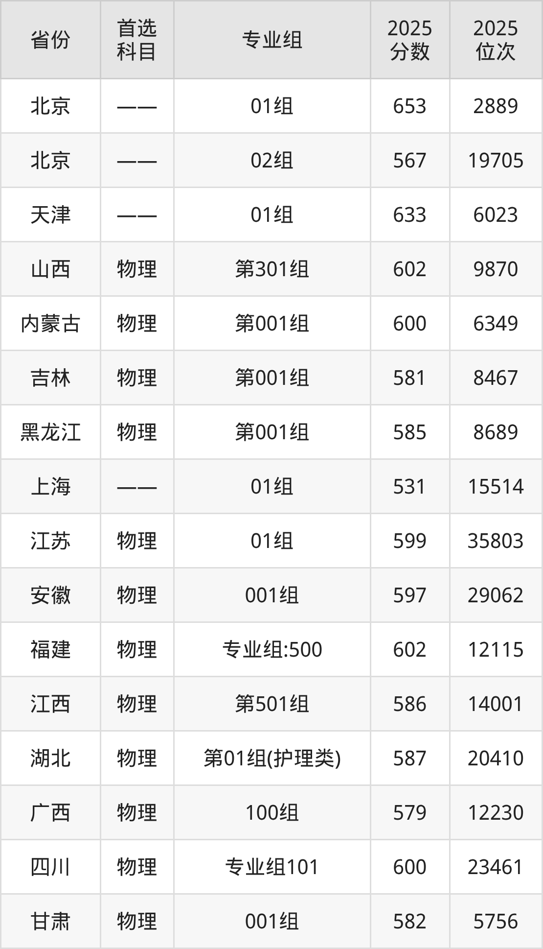 因为大部分地区目前只公布了院校(专业组)分数线,为了方便2026年考生参考,本文就整理出北京协和医学院在全国各省不同科类的最低分: