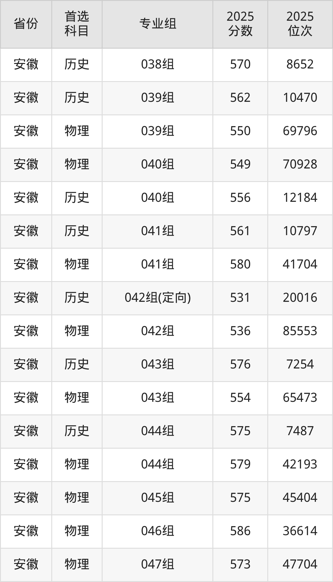 参考浙江2025年的录取数据,安徽师范大学各专业录取分数线如下: