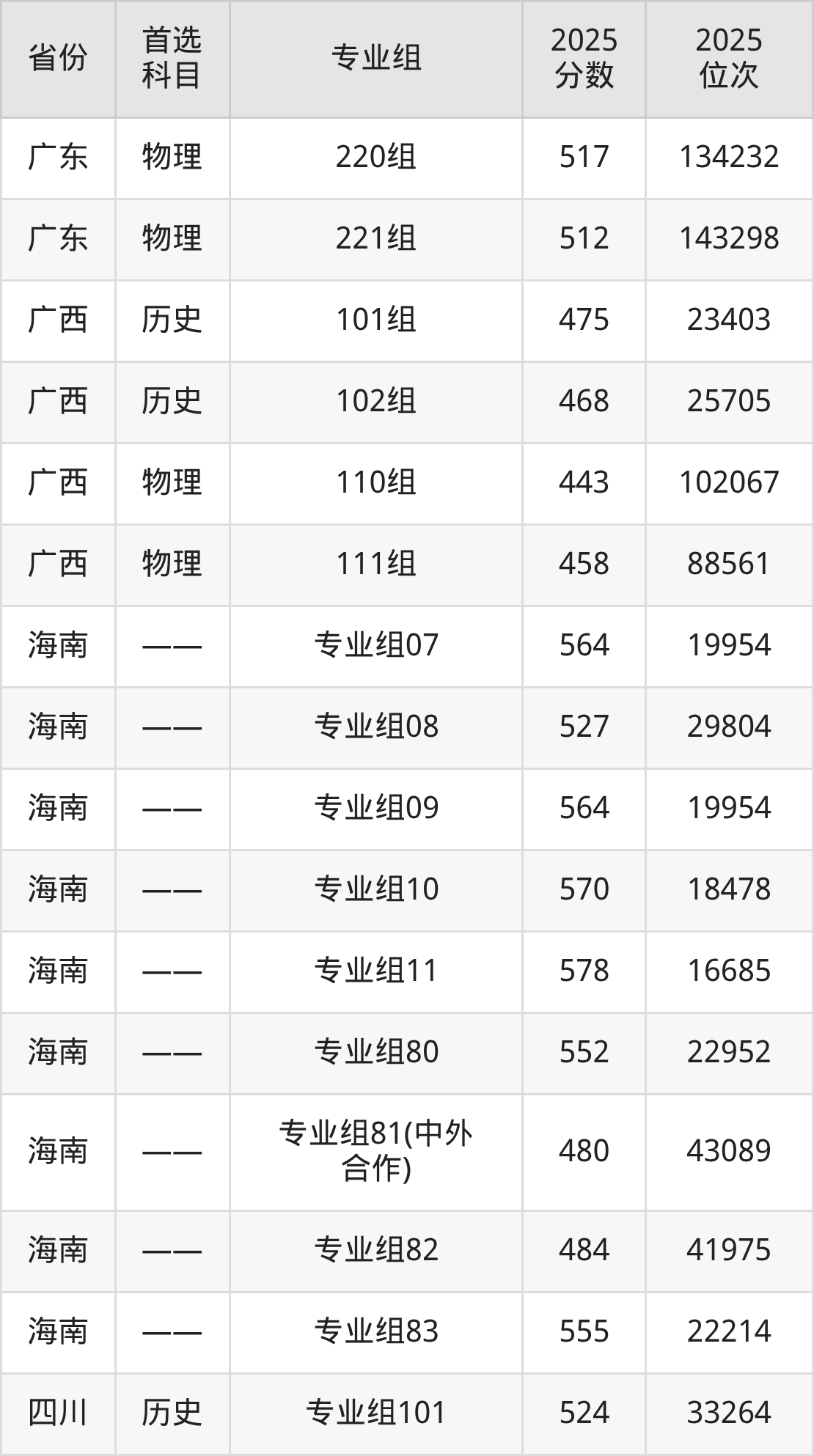 因为大部分地区目前只公布了院校(专业组)分数线,为了方便2026年考生参考,本文就整理出海南热带海洋学院在全国各省不同科类的最低分: