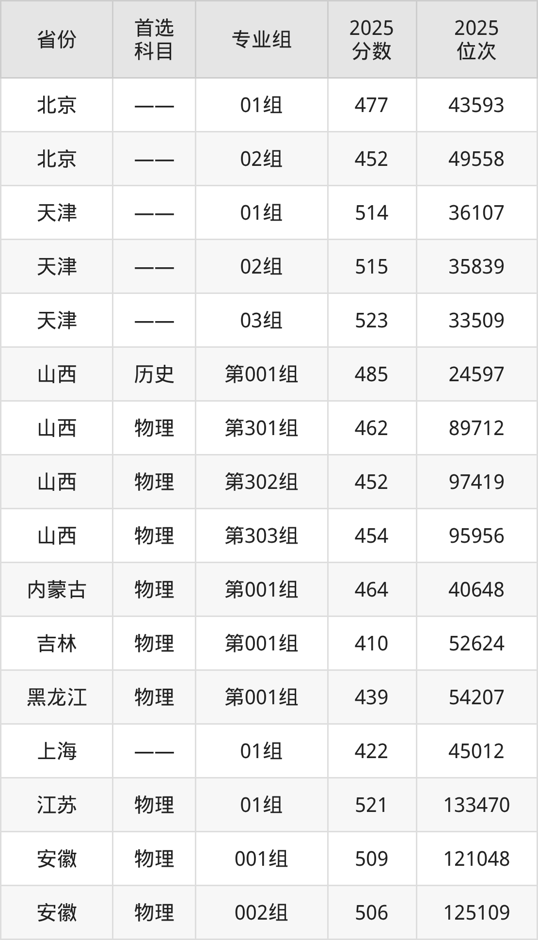 因为大部分地区目前只公布了院校(专业组)分数线,为了方便2026年考生参考,本文就整理出山西工学院在全国各省不同科类的最低分: