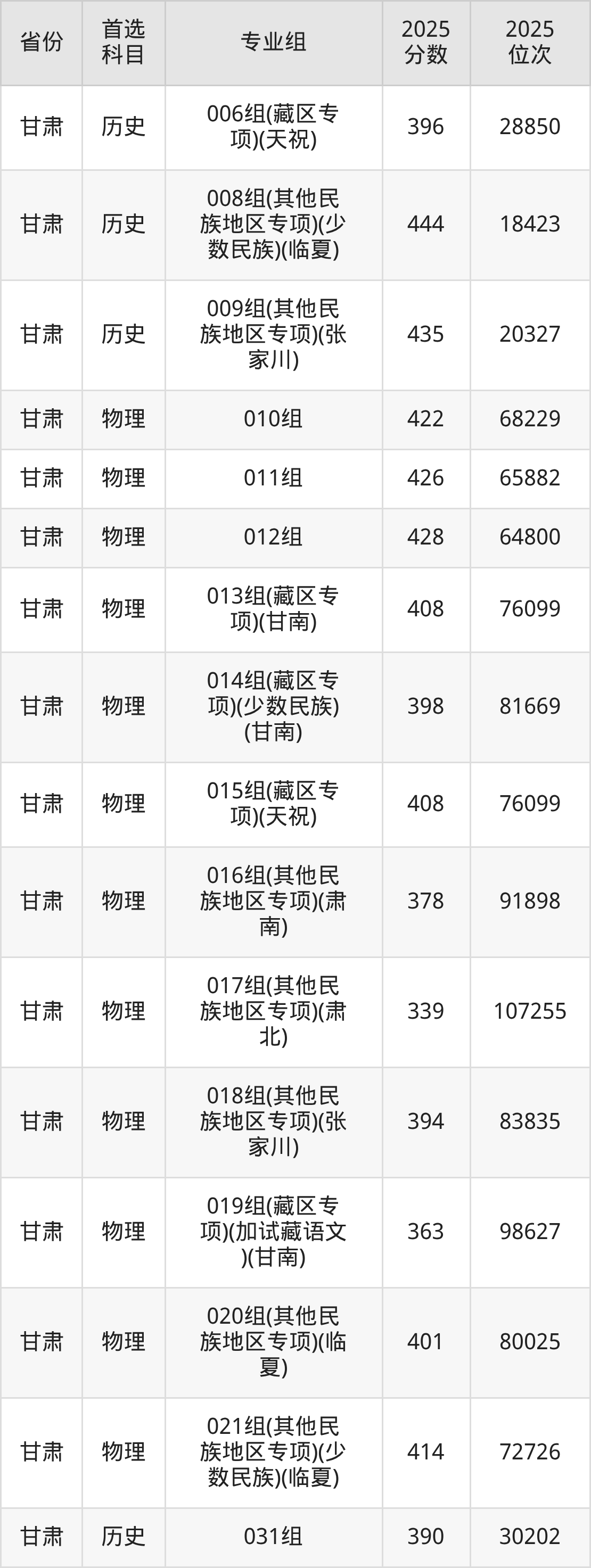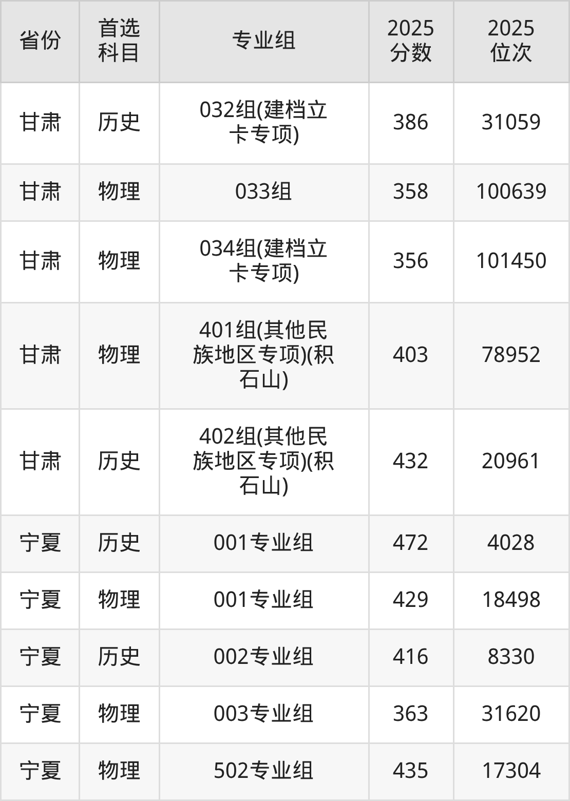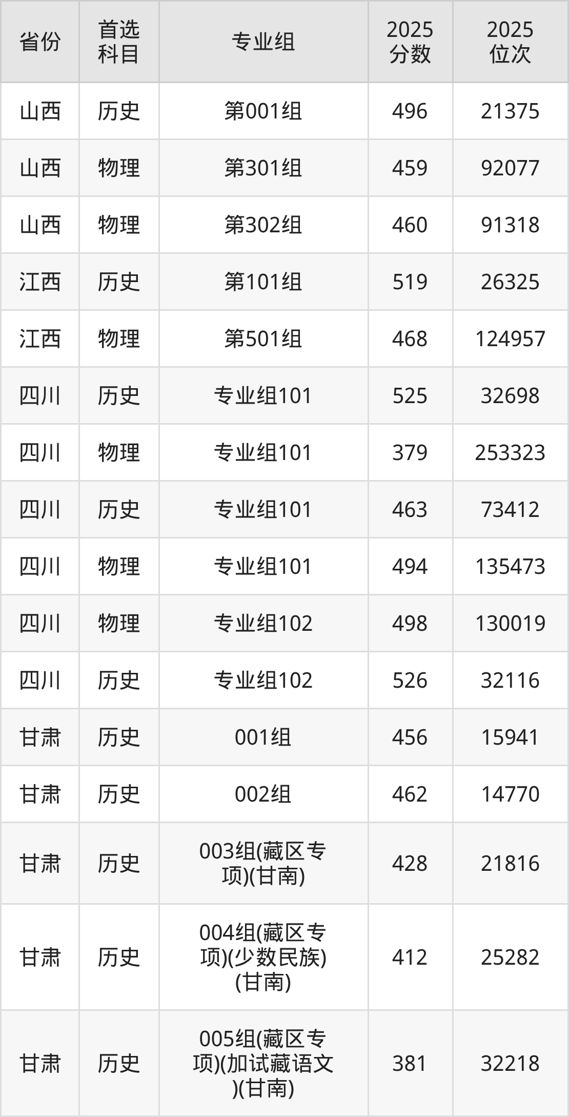因为大部分地区目前只公布了院校(专业组)分数线,为了方便2026年考生参考,本文就整理出陇南师范学院在全国各省不同科类的最低分: