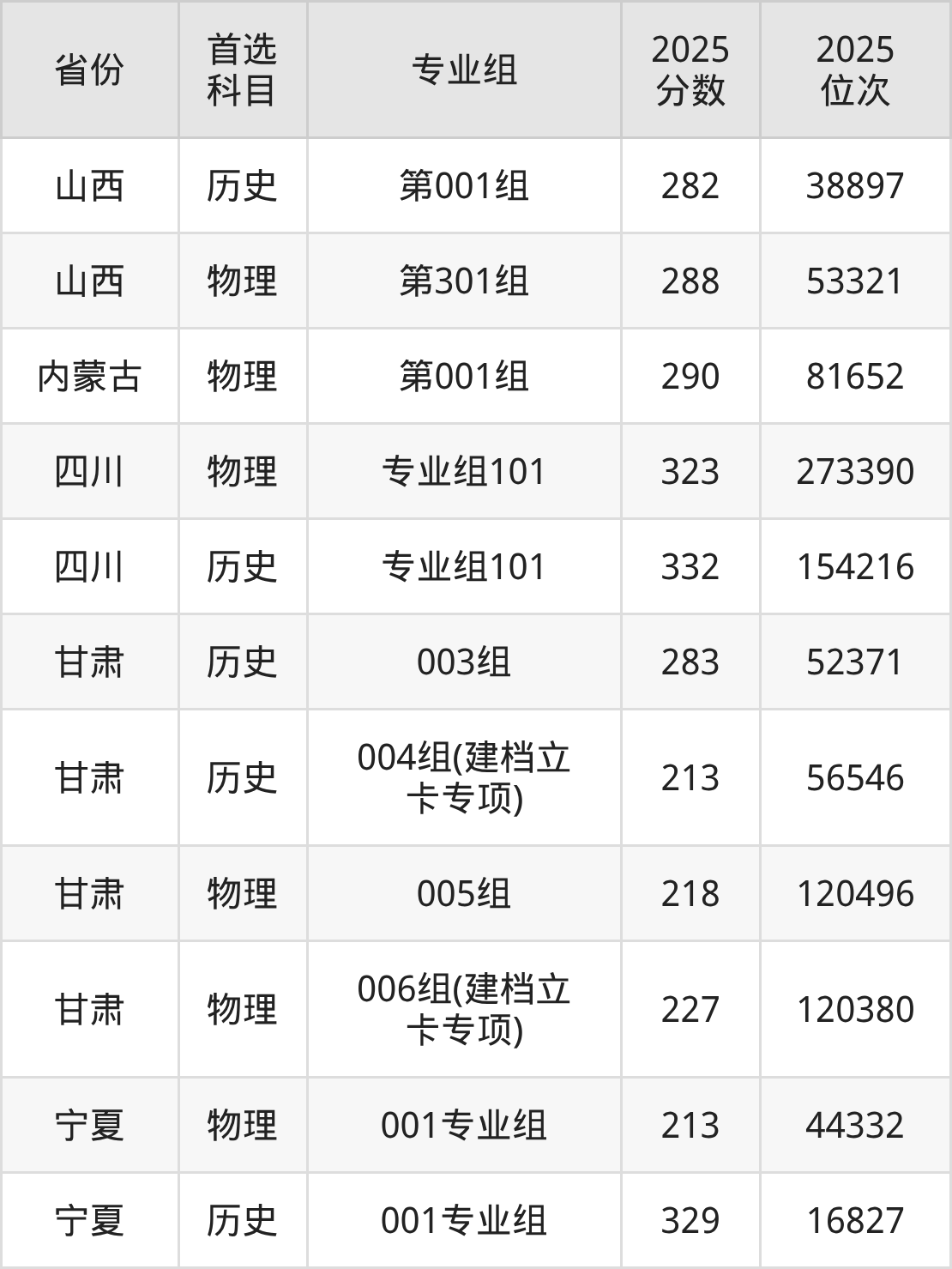 因为大部分地区目前只公布了院校(专业组)分数线,为了方便2026年考生参考,本文就整理出甘肃畜牧工程职业技术学院在全国各省不同科类的最低分: