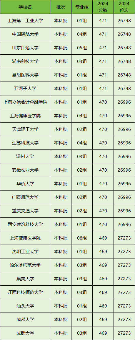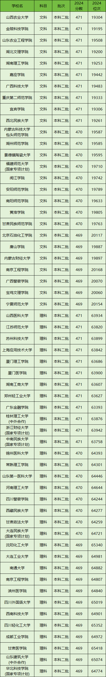 其中文科2024年分数线刚好是470分的有湖州师范学院、景德镇陶瓷大学、福建师范大学(国家专项计划)、闽江学院等;理科2024年分数线刚好是470分的有锦州医科大学、常熟理工学院、山东第一医科大学、河南理工大学等。