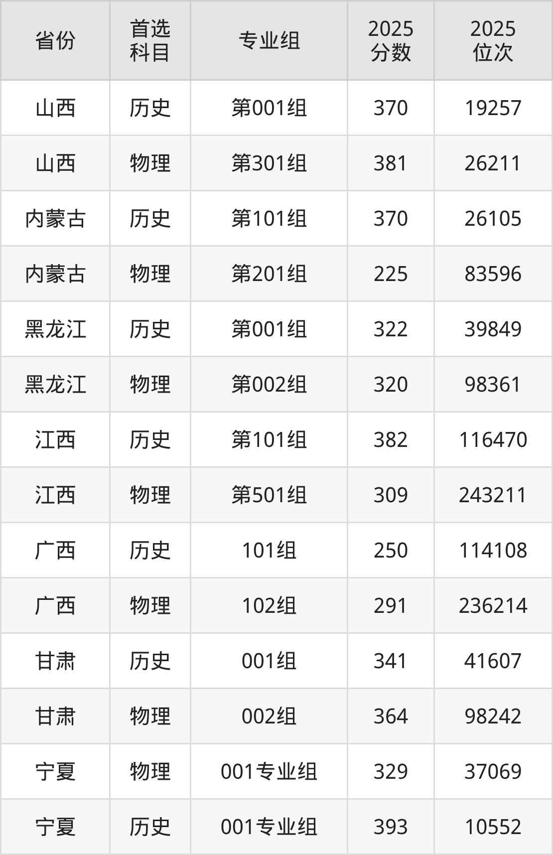 因为大部分地区目前只公布了院校(专业组)分数线,为了方便2026年考生参考,本文就整理出内蒙古机电职业技术学院在全国各省不同科类的最低分:
