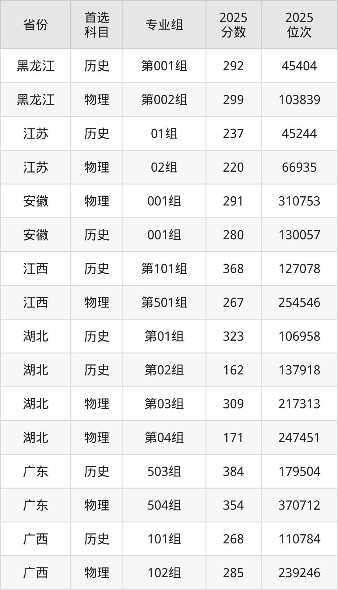 因为大部分地区目前只公布了院校(专业组)分数线,为了方便2026年考生参考,本文就整理出武汉光谷职业学院在全国各省不同科类的最低分: