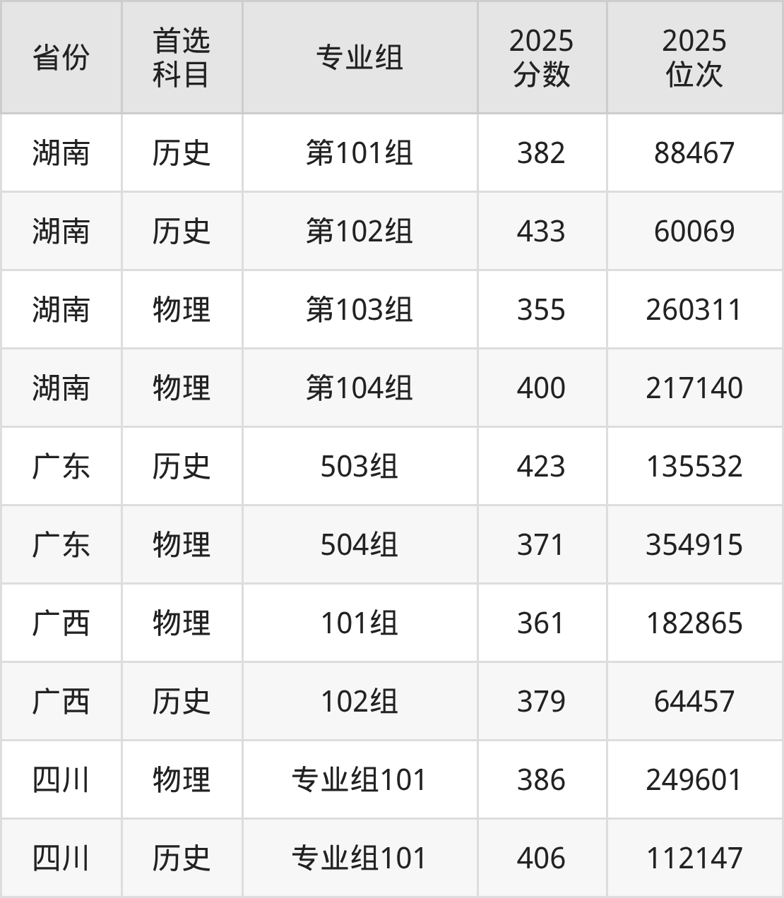 因为大部分地区目前只公布了院校(专业组)分数线,为了方便2026年考生参考,本文就整理出湖南环境生物职业技术学院在全国各省不同科类的最低分: