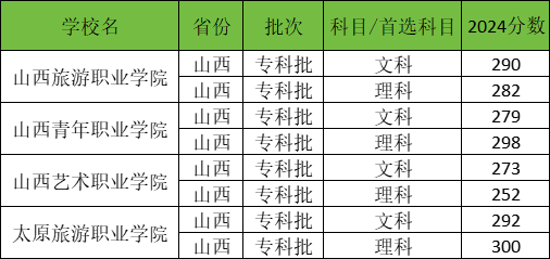 2024年山西艺术职业学院、山西旅游职业学院、太原旅游职业学院、山西青年职业学院专科批招生,各校最低录取分数线如下(以下为已公布的数据,作为参考):