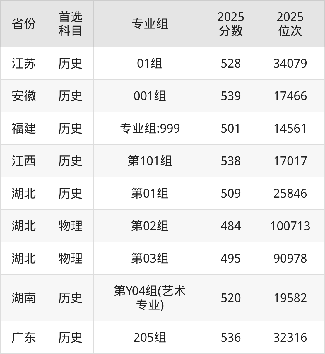 因为大部分地区目前只公布了院校(专业组)分数线,为了方便2026年考生参考,本文就整理出湖北美术学院在全国各省不同科类的最低分: