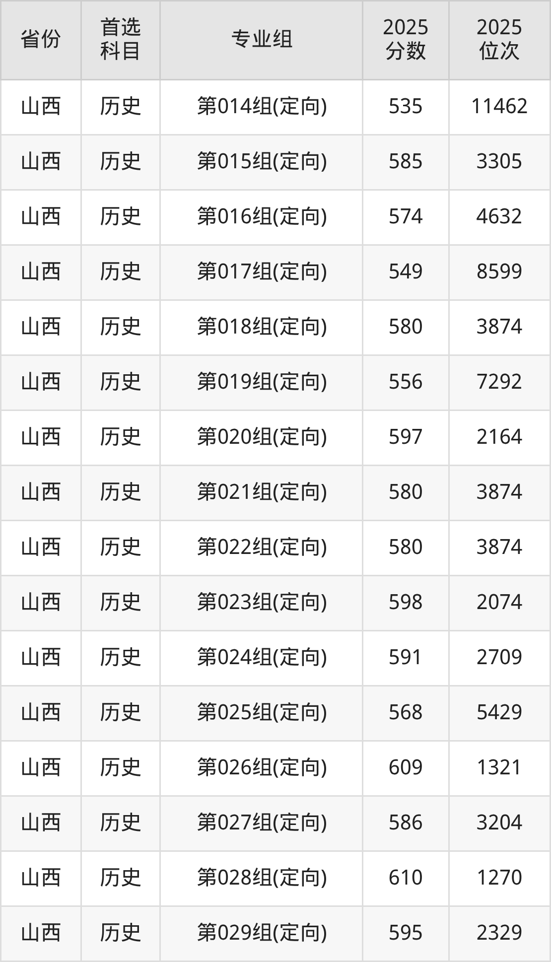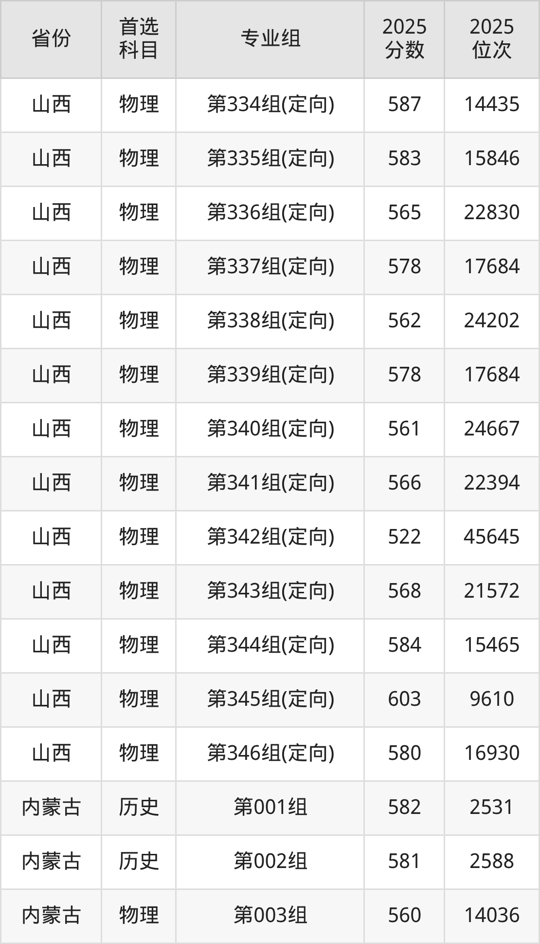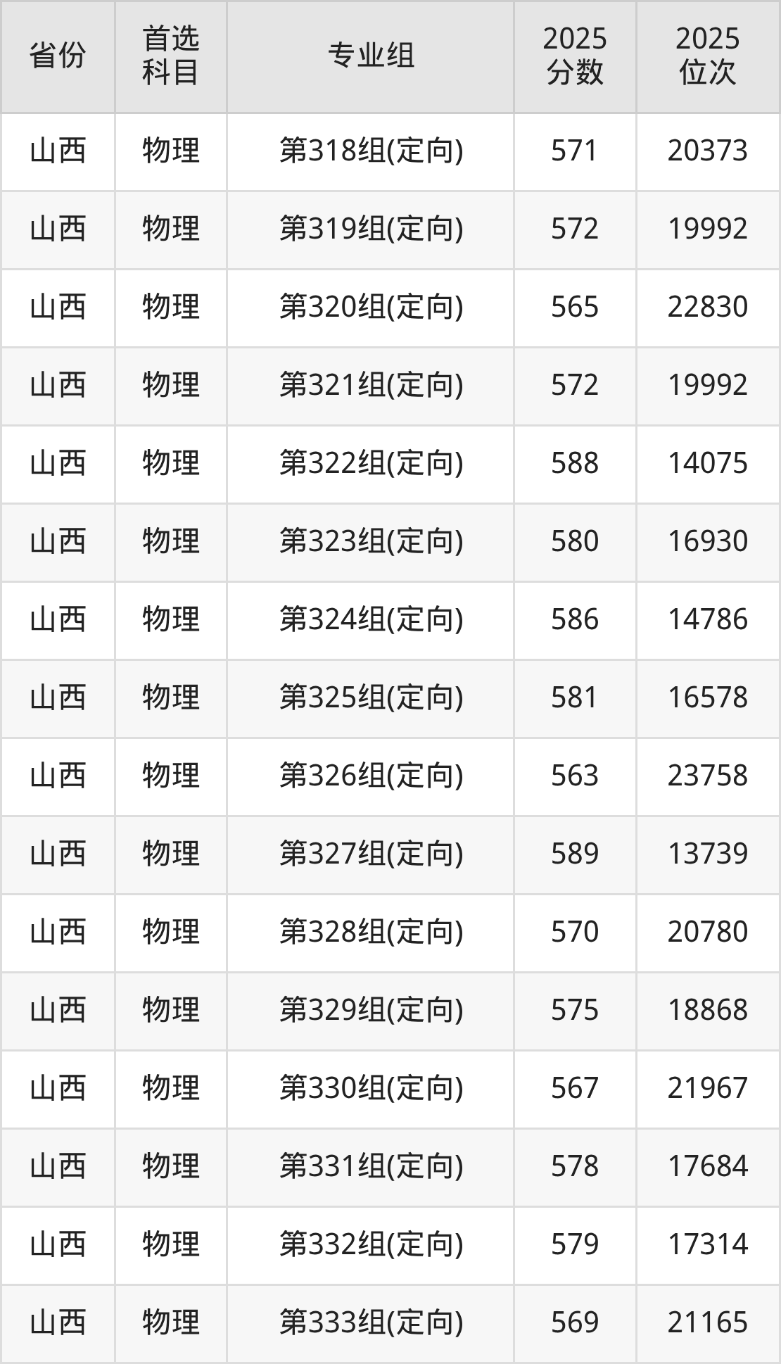 山西大学在全国各省分专业组录取分数线: