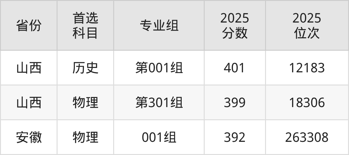 1.山西:物理类399分、18306位,历史类401分、12183位