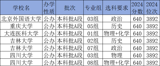 2024年云南640分对应排名:文科429名。由于录取分数线波动较大,因此建议2025年高考位次排名在430名左右的同学报考下表中的学校。