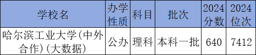 理科640分能上的大学有哈尔滨工业大学(中外合作)(大数据)。