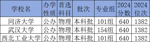 物理类640分能上的有同济大学、武汉大学、西北工业大学。