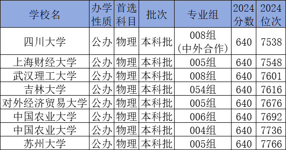 物理类640分能上的有四川大学、上海财经大学、武汉理工大学、吉林大学、对外经济贸易大学等。