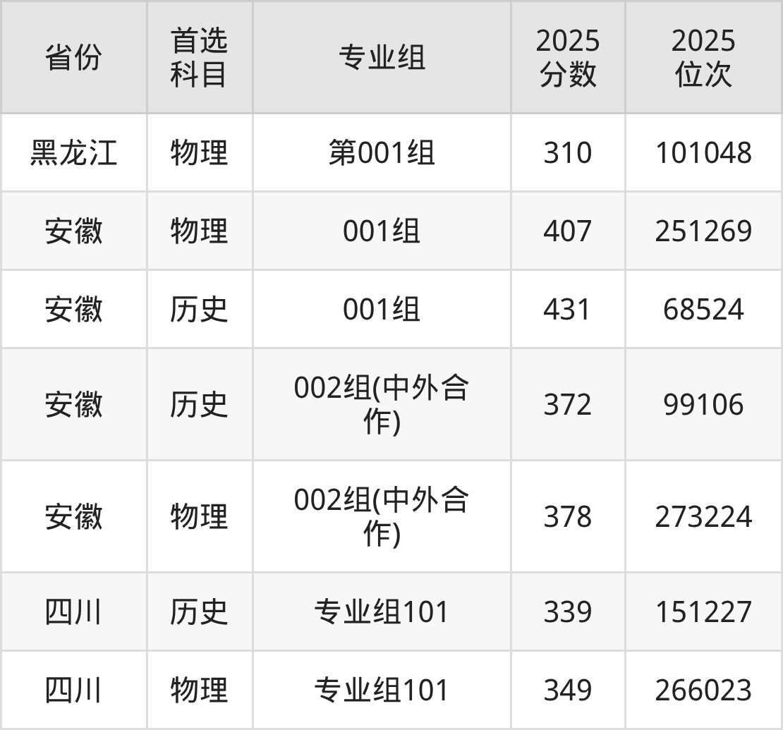 因为大部分地区目前只公布了院校(专业组)分数线,为了方便2026年考生参考,本文就整理出安徽财贸职业学院在全国各省不同科类的最低分: