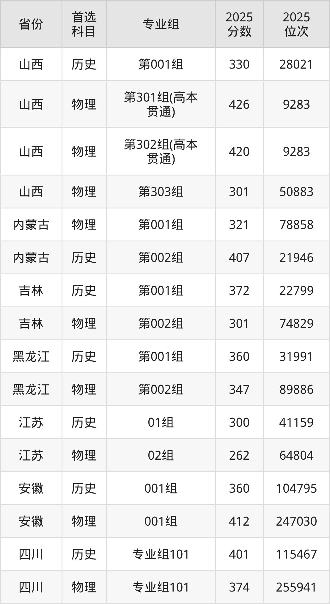 因为大部分地区目前只公布了院校(专业组)分数线,为了方便2026年考生参考,本文就整理出山西职业技术学院在全国各省不同科类的最低分: