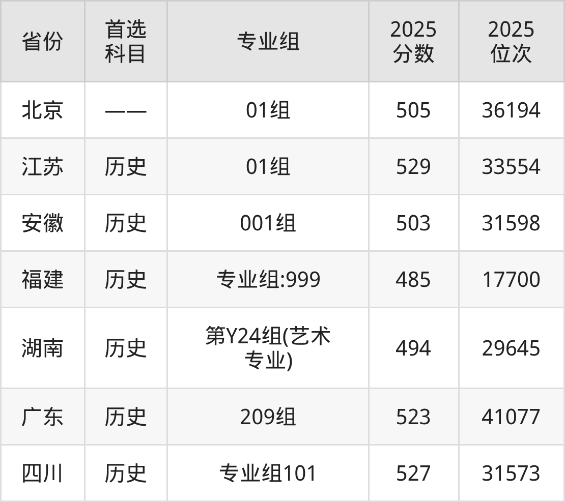因为大部分地区目前只公布了院校(专业组)分数线,为了方便2026年考生参考,本文就整理出山东艺术学院在全国各省不同科类的最低分: